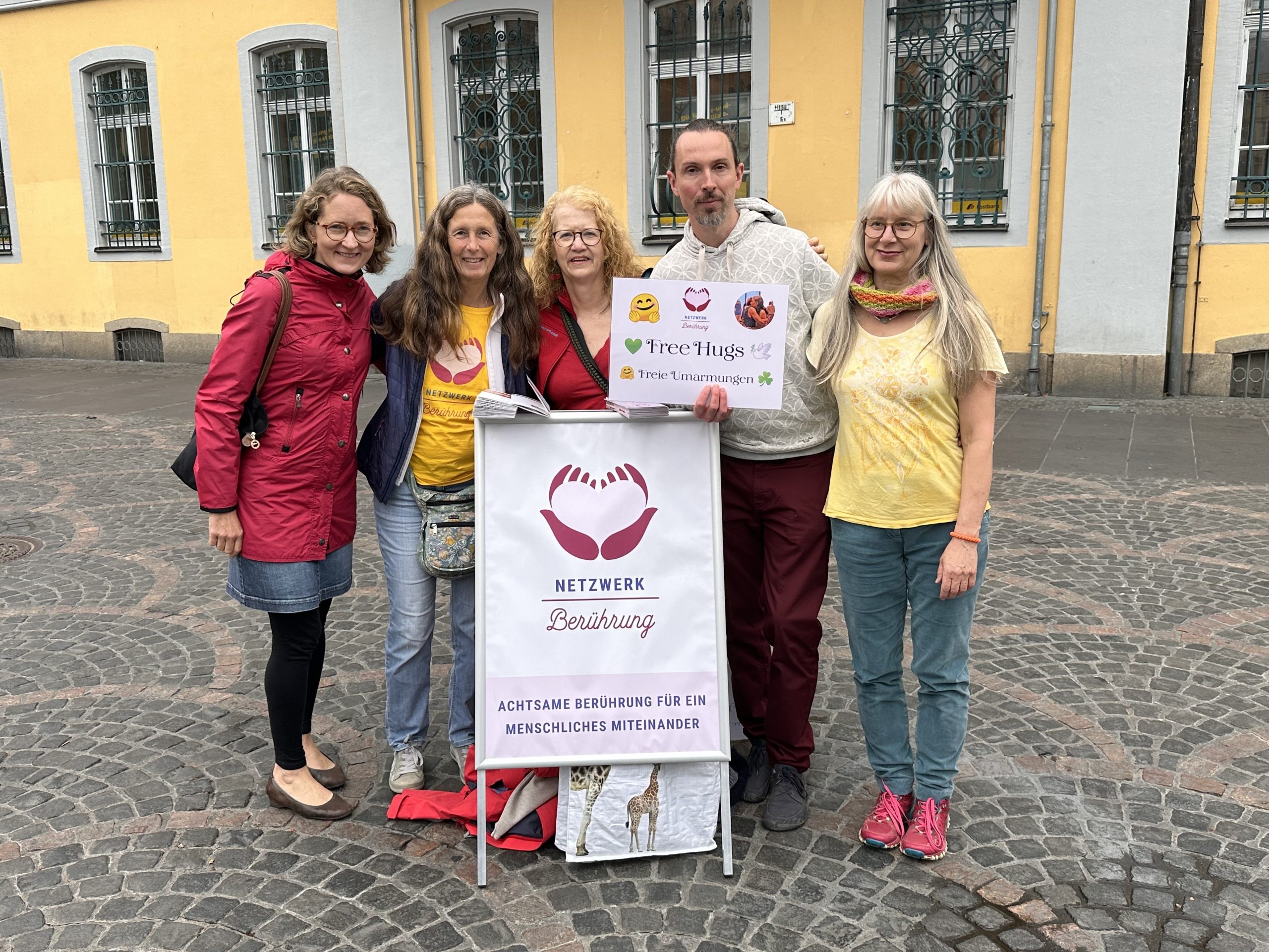 Wir waren fünf Mitglieder des Netzwerks Berührung, die diese Aktion organisiert und begleitet haben: Petra Feldbinder und ich (Tobias Frank) als Initiatoren, unterstützt von Dr. Anna Keller, Franka Meinertzhagen mit ihren Schildern und einem Aufsteller, sowie Ulrika Brandt. Spontan schloss sich noch eine Frau mit ihrer Tochter an. Ein schönes Zeichen dafür, wie offen und lebendig solche Begegnungen sein können.